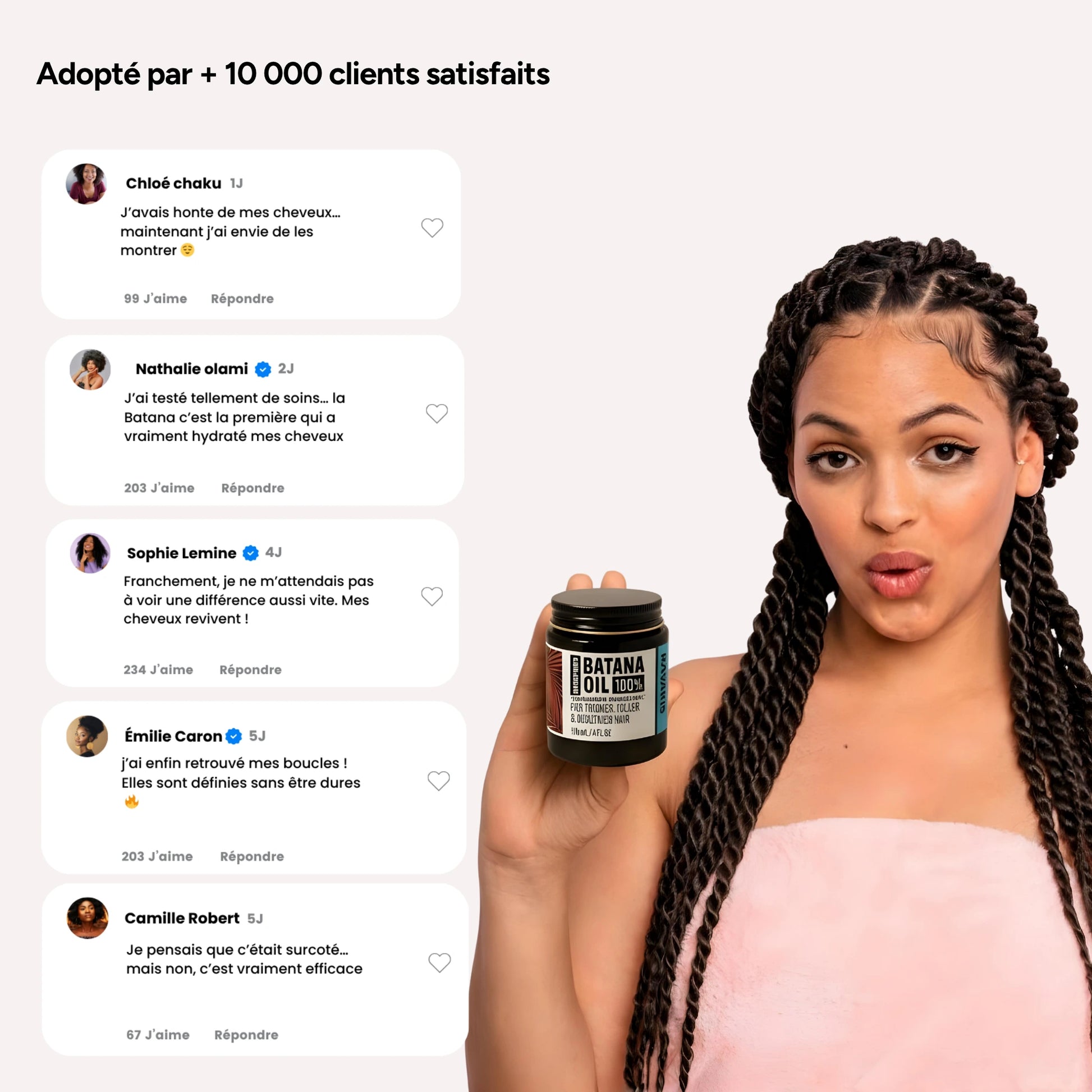 L’huile de Batana offre de nombreux bienfaits pour vos cheveux : elle les renforce, favorise leur croissance, améliore la santé du cuir chevelu, hydrate et apporte de la brillance.